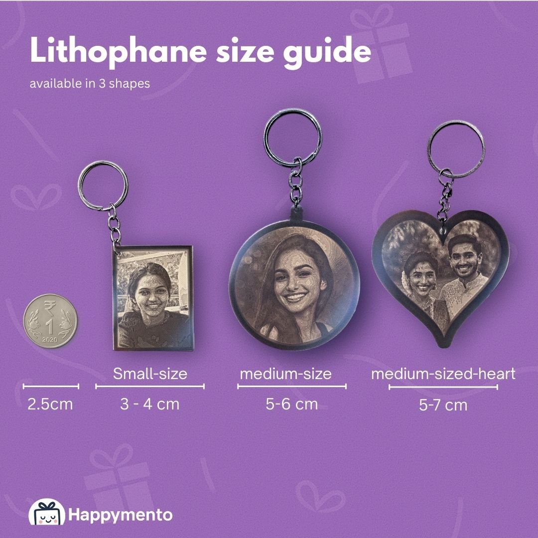 Custom 3D-printed lithophane keychain. Two sizes, three shapes, optional LED. Intro offer: Round & Rectangle at ₹149, Heart at ₹169 (regular ₹299).